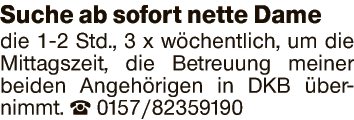 Suche ab sofort nette Dame die 1-2 Std., 3 x wöchentlich, um die Mittagszeit, die Betreuung meiner beiden Angehörigen in DKB ĂŒbernimmt.