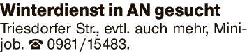 Winterdienst in AN gesucht Triesdorfer Str., evtl. auch mehr, Minijob.