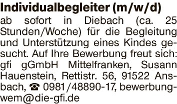 Individualbegleiter (m/w/d) ab sofort in Diebach (ca. 25 Stunden/Woche) fĂźr die Begleitung und UnterstĂźtzung eines Kindes gesucht.