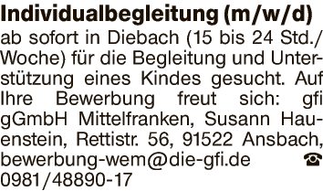 Individualbegleitung (m/w/d) ab sofort in Diebach (15 bis 24 Std./ Woche) fĂźr die Begleitung und UnterstĂźtzung eines Kindes gesucht.