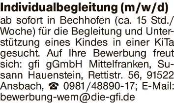 Individualbegleitung (m/w/d) ab sofort in Bechhofen (ca. 15 Std./Woche) fĂźr die Begleitung und UnterstĂźtzung eines Kindes in einer KiTa gesucht.