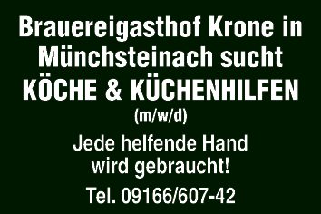 Brauereigasthof Krone in Münchsteinach sucht KÖCHE (m/w/d).