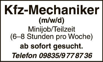Kfz-Mechaniker (m/w/d) Minijob/Teilzeit (6–8 Stunden pro Woche) ab sofort gesucht.