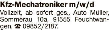 Kfz-Mechatroniker m/w/d Vollzeit, ab sofort ges.