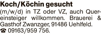 Koch/Köchin gesucht (m/w/d) in TZ oder VZ, auch Quereinsteiger willkommen.