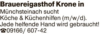 Brauereigasthof Krone in Münchsteinach sucht Köche (m/w/d).