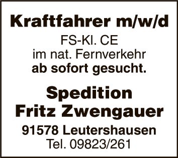 Kraftfahrer m/w/d FS-Kl. CE im nat. Fernverkehr ab sofort gesucht.
