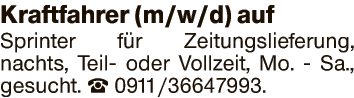 Kraftfahrer (m/w/d) auf Sprinter fĂźr Zeitungslieferung, nachts, Teil- oder Vollzeit, Mo. - Sa., gesucht.