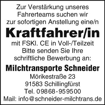 Zur Verstärkung unseres Fahrerteams suchen wir zur sofortigen Anstellung eine/n