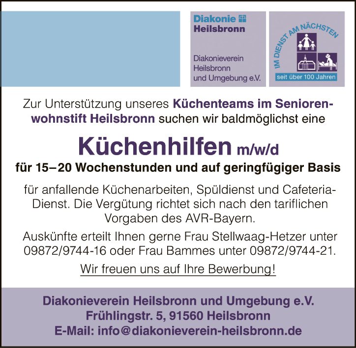 Zur Unterstützung unseres Küchenteams im Seniorenwohnstift Heilsbronn suchen wir baldmöglichst eine