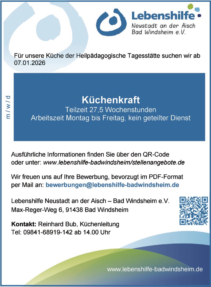 Ausführliche Informationen finden Sie über den QR-Code oder unter: www.lebenshilfe-badwindsheim/stellenangebote.de