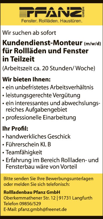 • Erfahrung im Bereich Rollladen- und Fensterbau wäre von Vorteil