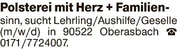 Polsterei mit Herz + Familiensinn, sucht Lehrling/Aushilfe/Geselle (m/w/d) in 90522 Oberasbach.