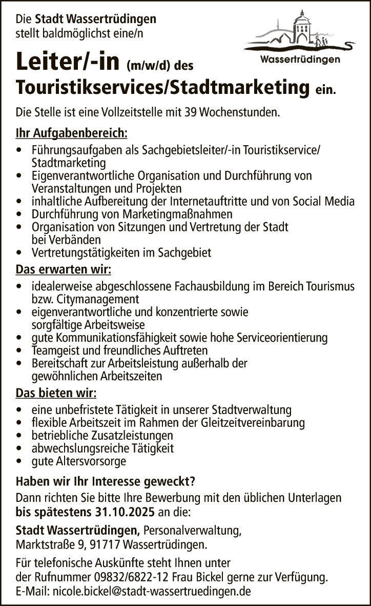 Die Stadt Wassertrüdingen stellt baldmöglichst eine/n Leiter/-in (m/w/d) des Touristikservices/Stadtmarketing ein.