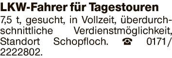 für Tagestouren 7,5 t, gesucht, in Vollzeit, überdurchschnittliche Verdienstmöglichkeit, Standort Schopfloch.