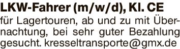Kl. CE für Lagertouren, ab und zu mit Übernachtung, bei sehr guter Bezahlung gesucht.