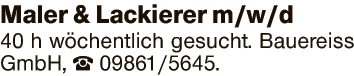 Maler & Lackierer m/w/d 40 h wöchentlich gesucht.