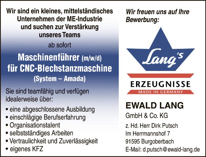 Wir sind ein kleines, mittelständisches Unternehmen der ME-Industrie und suchen zur Verstärkung unseres Teams ab sofort Maschinenführer (m/w/d) für CNC-Blechstanzmaschine.