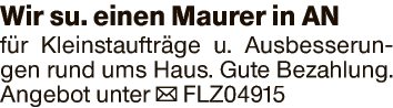 Wir su. einen Maurer in AN fßr Kleinstaufträge u. Ausbesserungen rund ums Haus. Gute Bezahlung.