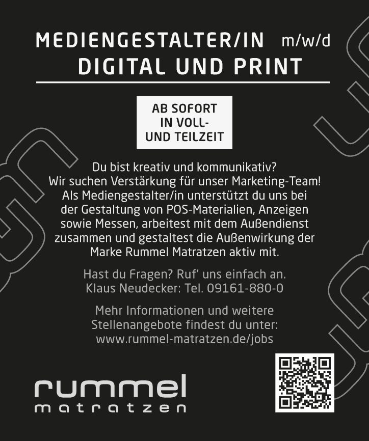 Du bist kreativ und kommunikativ? Wir suchen Verstärkung für unser Marketing-Team! Als Mediengestalter/in unterstützt du uns bei der Gestaltung von POS-Materialien, Anzeigen sowie Messen, arbeitest mit dem Außendienst zusammen und gestaltest die Außenwirkung der Marke Rummel Matratzen aktiv mit.