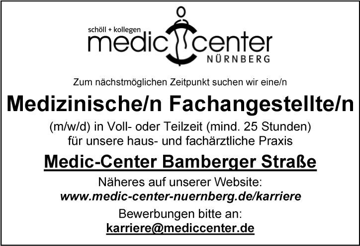 Näheres auf unserer Website: www.medic-center-nuernberg.de/karriere