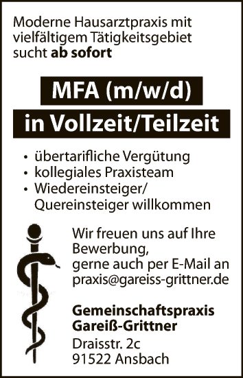 Moderne Hausarztpraxis mit vielfältigem Tätigkeitsgebiet sucht ab sofort MFA (m/w/d) in Vollzeit/Teilzeit.