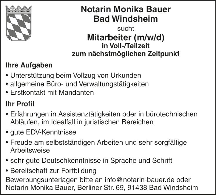 Notarin Monika Bauer Bad Windsheim sucht Mitarbeiter (m/w/d) in Voll-/Teilzeit zum nächstmöglichen Zeitpunkt.