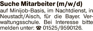 Suche Mitarbeiter (m/w/d) auf Minijob-Basis, im Nachtdienst, in Neustadt/Aisch, fĂźr die Bayer. Verwaltungsschule.