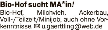 Bio-Hof, Milchvieh, Ackerbau, Voll-/Teilzeit/Minijob, auch ohne Vorkenntnisse.