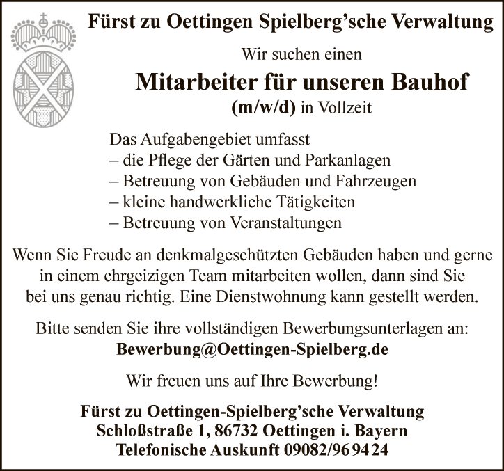 Bitte senden Sie ihre vollständigen Bewerbungsunterlagen an: Bewerbung@Oettingen-Spielberg.de
