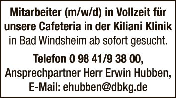 Mitarbeiter (m/w/d) in Vollzeit für unsere Cafeteria in der Kiliani Klinik in Bad Windsheim ab sofort gesucht.
