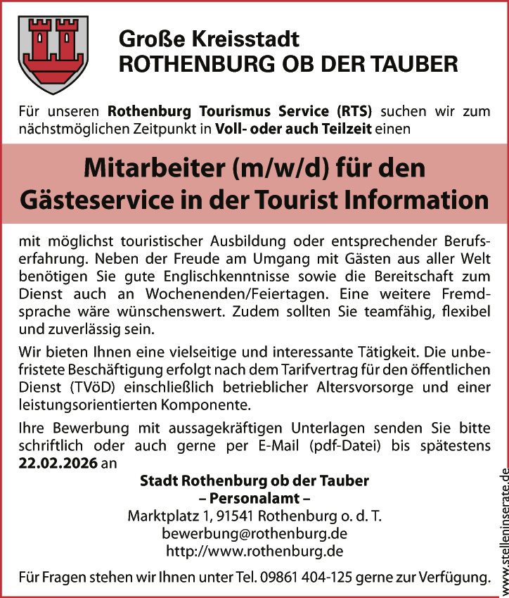 Für unseren Rothenburg Tourismus Service (RTS) suchen wir zum nächstmöglichen Zeitpunkt in Voll- oder auch Teilzeit einen Mitarbeiter (m/w/d) für den Gästeservice in der Tourist Information mit möglichst touristischer Ausbildung oder entsprechender Berufserfahrung.