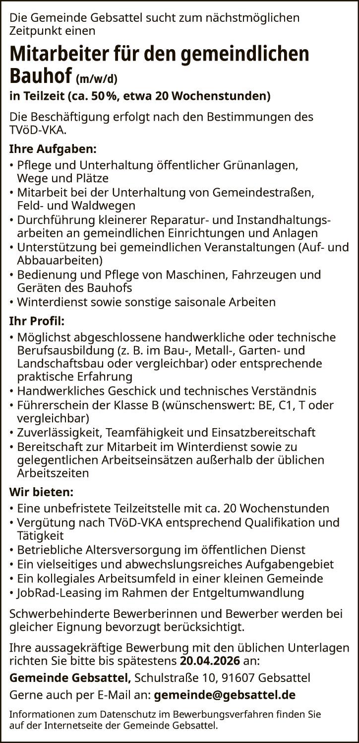 Die Gemeinde Gebsattel sucht zum nächstmöglichen Zeitpunkt einen Mitarbeiter für den gemeindlichen Bauhof (m/w/d) in Teilzeit (ca. 50 %, etwa 20 Wochenstunden).