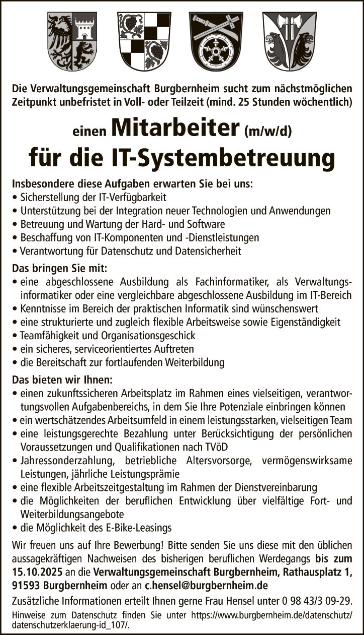 Die Verwaltungsgemeinschaft Burgbernheim sucht zum nächstmöglichen Zeitpunkt unbefristet in Voll- oder Teilzeit (mind. 25 Stunden wöchentlich) einen Mitarbeiter (m/w/d) für die IT-Systembetreuung.