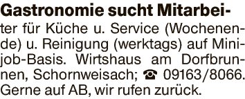 Gastronomie sucht Mitarbeiter für Küche u. Service