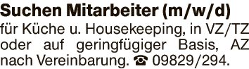 Suchen Mitarbeiter (m/w/d) für Küche u. Housekeeping, in VZ/TZ oder auf geringfügiger Basis, AZ nach Vereinbarung.