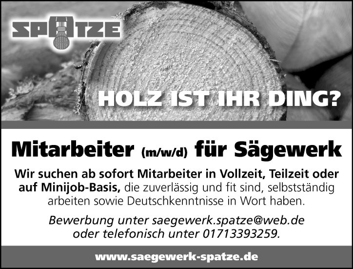 Bewerbung unter saegewerk.spatze@web.de oder telefonisch unter 01713393259.