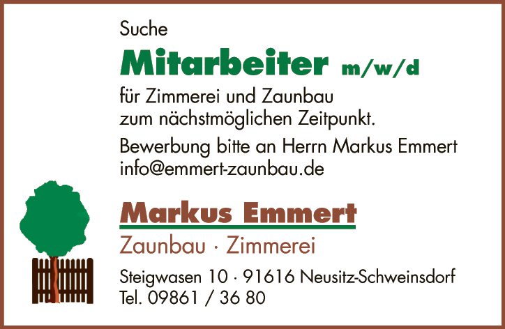 Bewerbung bitte an Herrn Markus Emmert, info@emmert-zaunbau.de