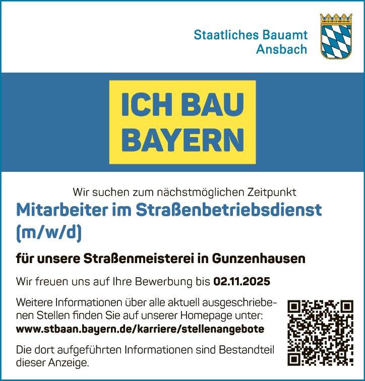 Wir suchen zum nächstmöglichen Zeitpunkt Mitarbeiter im Straßenbetriebsdienst (m/w/d) für unsere Straßenmeisterei in Gunzenhausen.