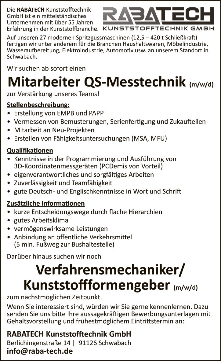 Jetzt Printanzeige ansehenDie RABATECH Kunststofftechnik GmbH ist ein mittelständisches Unternehmen mit über 55 Jahren Erfahrung in der Kunststoffbranche.