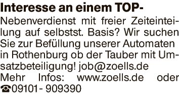 Interesse an einem TOP-Nebenverdienst mit freier Zeiteinteilung auf selbstst. Basis? Wir suchen Sie zur Befüllung unserer Automaten in Rothenburg ob der Tauber mit Umsatzbeteiligung!