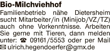 Arbeiten Sie gerne mit Tieren, dann melden unter: Tel.: 09161/5553 oder per Mail ulrich.hegendoerfer@gmx.de