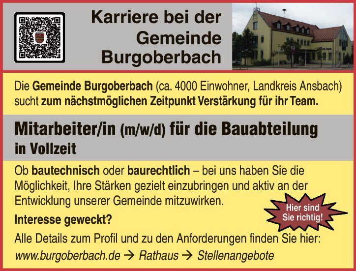 Alle Details zum Profil und zu den Anforderungen finden Sie hier: www.burgoberbach.de - Rathaus - Stellenangebote