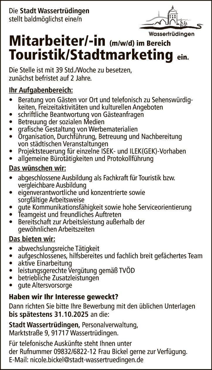Die Stadt Wassertrüdingen stellt baldmöglichst eine/n Mitarbeiter/-in (m/w/d) im Bereich Touristik/Stadtmarketing ein.