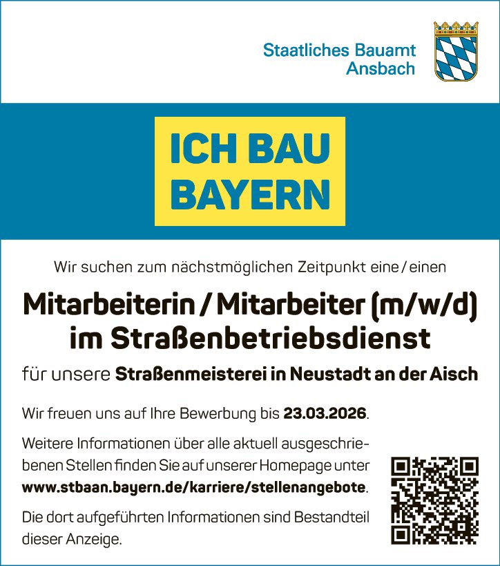 Wir suchen zum nächstmöglichen Zeitpunkt eine / einen Mitarbeiterin/Mitarbeiter (m/w/d) im Straßenbetriebsdienst für unsere Straßenmeisterei in Neustadt an der Aisch.
