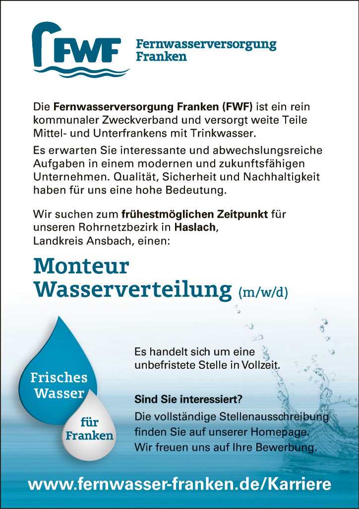 Die Fernwasserversorgung Franken (FWF) ist ein rein kommunaler Zweckverband und versorgt weite Teile Mittel- und Unterfrankens mit Trinkwasser.