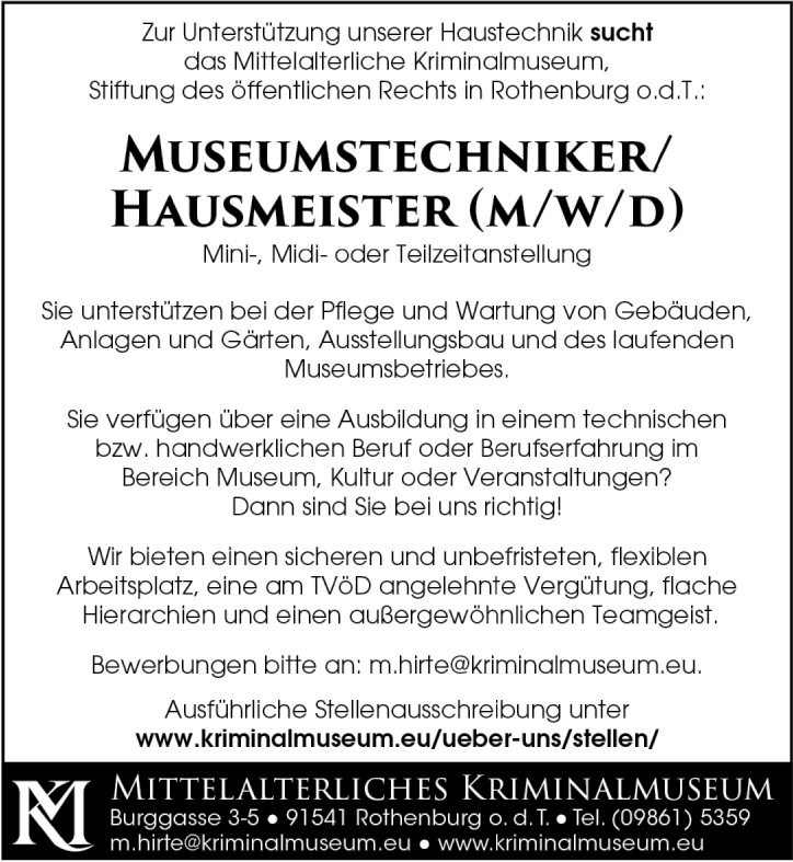 Zur Unterstützung unserer Haustechnik sucht das Mittelalterliche Kriminalmuseum, Stiftung des öffentlichen Rechts in Rothenburg o.d.T.: Museumstechniker/ Hausmeister (m/w/d) Mini-, Midi- oder Teilzeitanstellung.