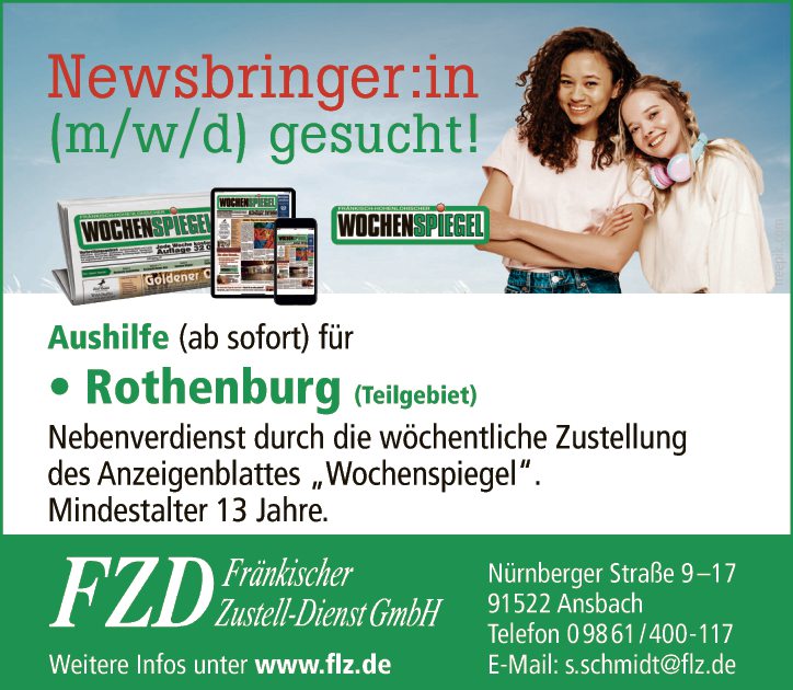 Nebenverdienst durch die wöchentliche Zustellung des Anzeigenblattes „Wochenspiegel“. Mindestalter 13 Jahre.
