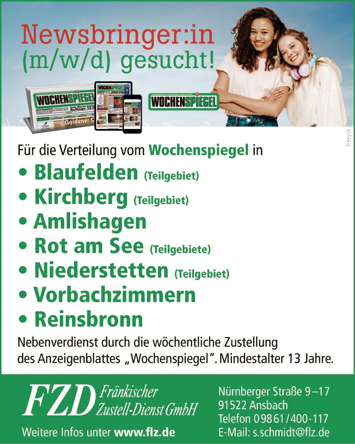 Nebenverdienst durch die wöchentliche Zustellung des Anzeigenblattes „Wochenspiegel“. Mindestalter 13 Jahre.