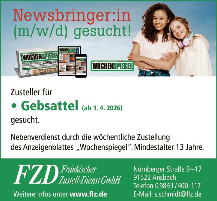 Nebenverdienst durch die wöchentliche Zustellung des Anzeigenblattes „Wochenspiegel“. Mindestalter 13 Jahre.
